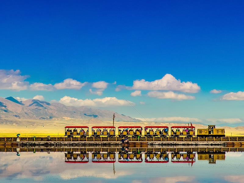天空之鏡(優勢):拍照取景點多,有老劇場,廣場,鹽雕群,尤其是網紅打卡小火車-時速8公里的專列,可以深入鹽湖深處,應該是您想乘坐的列車。